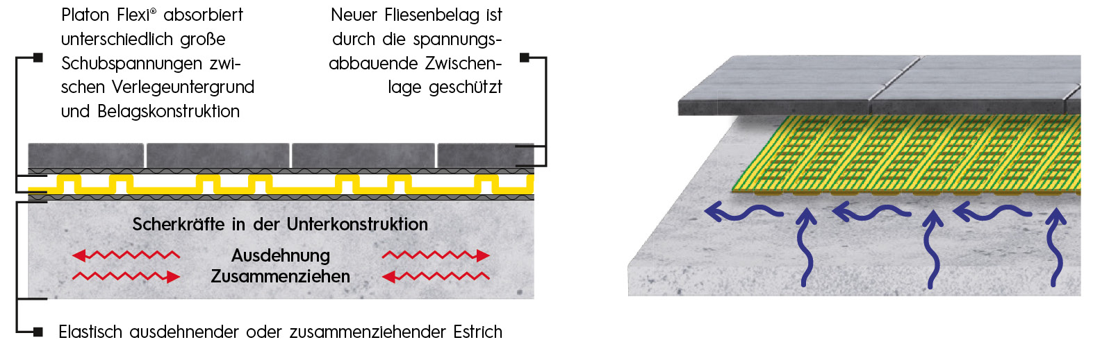 The decoupling mat Platon® Flexi Original with grid offers an effective solution for decoupling and sealing tiles and natural stone. It consists of a combination of studded foil, polypropylene fleece, and an integrated grid, which ensures maximum adhesion and stability. This mat reliably bridges cracks up to 2 mm and protects against moisture, stresses, and substrate movements.